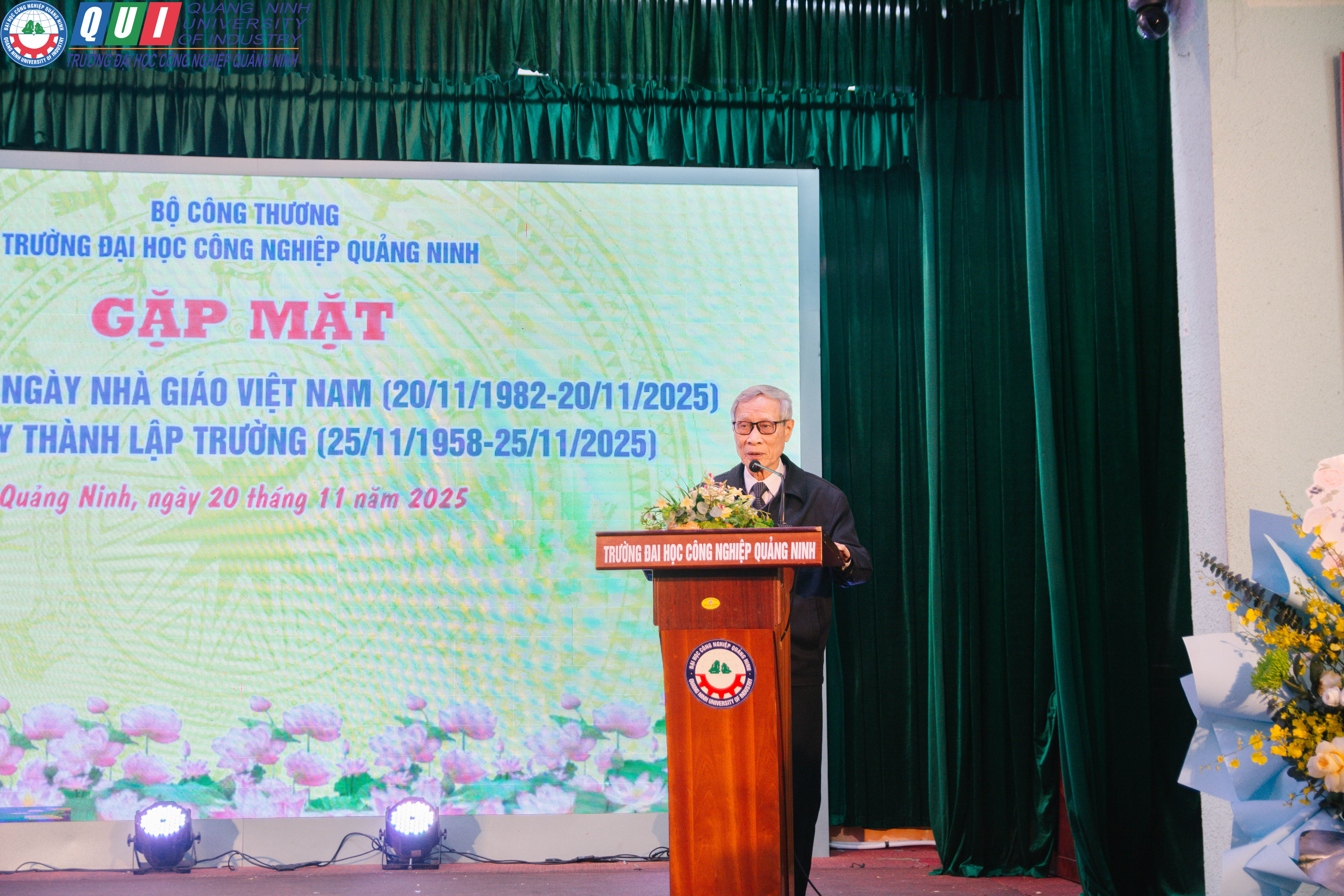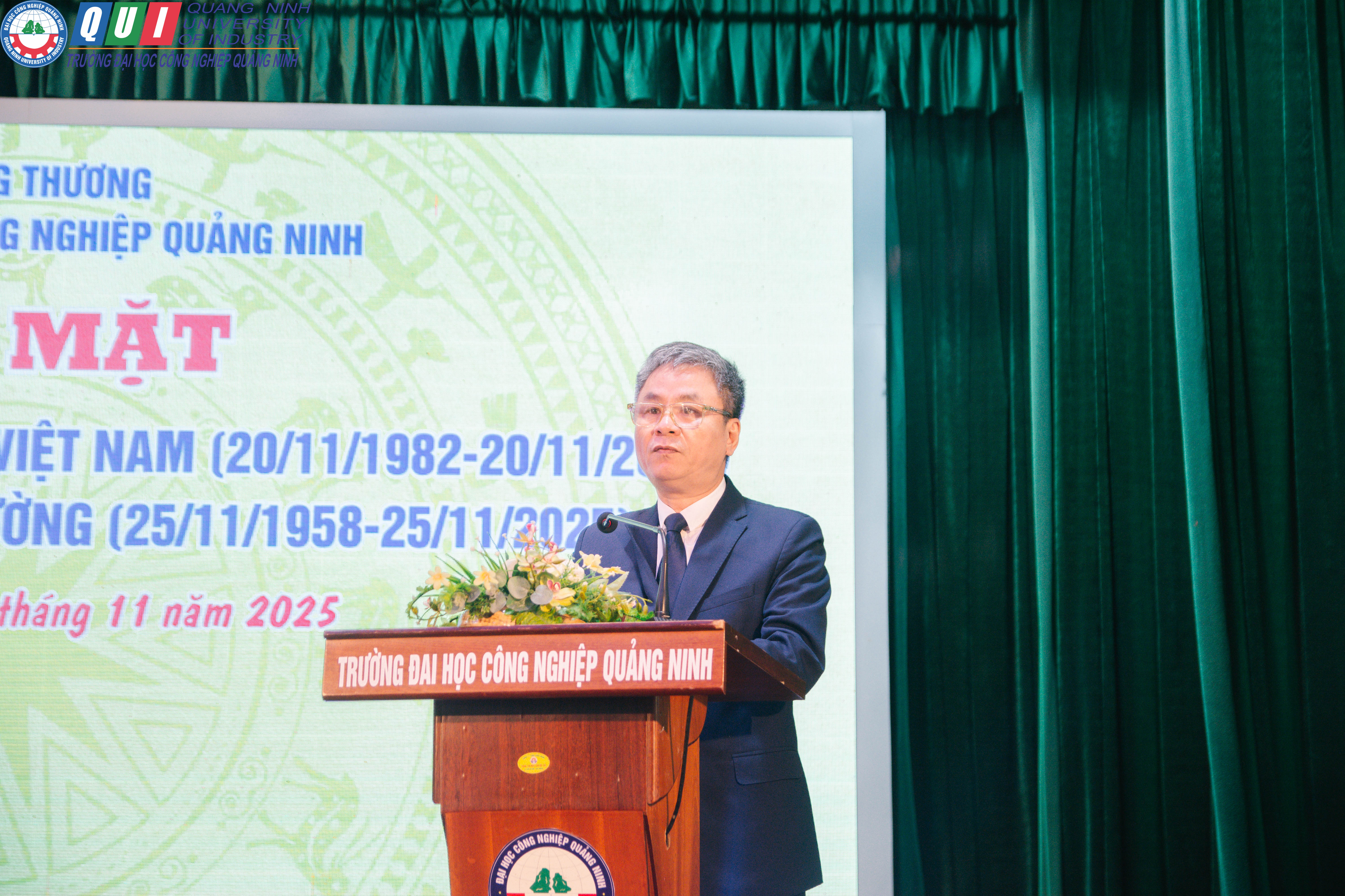 Thay mặt cho Ban giám hiệu, TS. Hoàng Hùng Thắng - Hiệu trưởng Nhà trường đã ôn lại truyền thống ngày Nhà giáo Việt Nam và truyền thống 67 năm phát triển của Nhà trường, thầy khẳng định:“67 năm là hành trình của nỗ lực, của kiên trì và đổi mới. Trường Đại học Công nghiệp Quảng Ninh luôn tự hào với truyền thống đào tạo nguồn nhân lực chất lượng cao cho ngành Công Thương, cho tỉnh Quảng Ninh và cho đất nước. Mỗi thầy cô chính là điểm tựa để Nhà trường tiếp tục phát triển mạnh mẽ trong thời kỳ chuyển đổi số và hội nhập quốc tế. Nhân ngày Nhà giáo Việt Nam 20/11, tôi xin gửi tới toàn thể thầy cô, cán bộ, viên chức và người lao động của Nhà trường lời chúc mừng trân trọng và tình cảm tri ân sâu sắc. Ngày 20/11 không chỉ là một ngày lễ, mà còn là khoảnh khắc để chúng ta nhìn lại những điều tốt đẹp mà nghề giáo đã gieo vào đời sống - đó là tri thức, là sự tử tế, là những giá trị mà thầy cô vẫn âm thầm bồi đắp cho bao thế hệ sinh viên. Tôi luôn cảm nhận rõ tâm huyết của các thầy cô trong từng bài giảng, từng hoạt động hỗ trợ sinh viên và trong cả những việc nhỏ nhất phía sau cánh cửa lớp học. Chính sự tận tâm ấy đã tạo nên một QUI ấm áp, nhân văn và đầy năng lượng tích cực - một môi trường nơi sinh viên được khơi gợi đam mê, được lắng nghe, được tôn trọng và được truyền cảm hứng để trưởng thành. Trong thời gian tới, Nhà trường sẽ tiếp tục nỗ lực cải thiện điều kiện giảng dạy, thúc đẩy đổi mới sáng tạo và mở rộng cơ hội học tập - nghiên cứu, để mỗi thầy cô có thêm động lực và niềm vui trên hành trình cống hiến. Chúng ta sẽ cùng nhau xây dựng một QUI hiện đại, giàu bản sắc, và luôn là nơi ươm mầm tương lai cho các thế hệ sinh viên”
