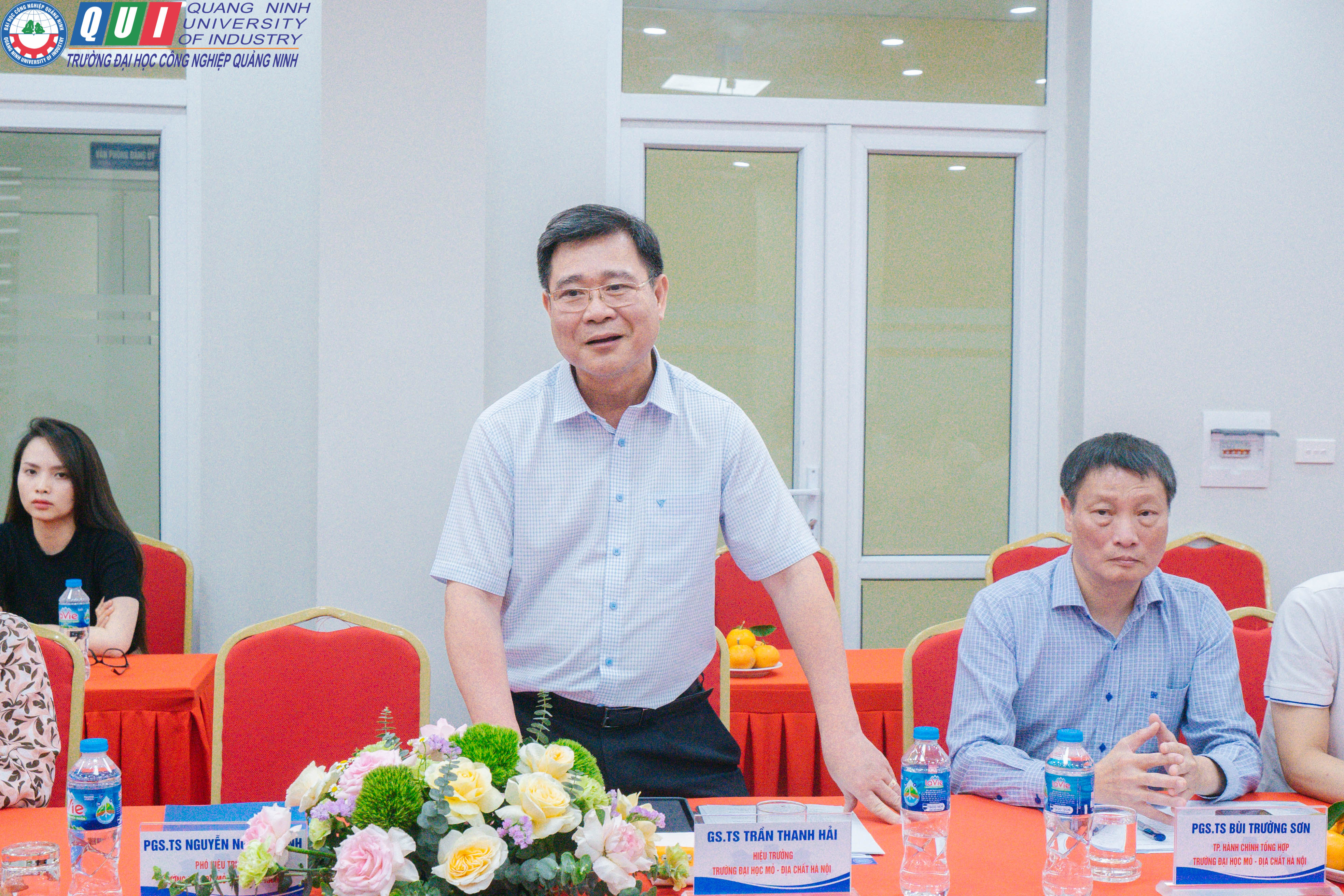 Đại diện Đoàn công tác Trường Đại học Mỏ - Địa chất GS.TS Trần Thanh Hải - Hiệu trưởng cũng đánh giá cao sự chuẩn bị chu đáo và tinh thần hợp tác của Trường Đại học Công nghiệp Quảng Ninh. Đồng thời bày tỏ mong muốn hai bên sẽ sớm triển khai các chương trình phối hợp cụ thể như: trao đổi giảng viên, sinh viên; tổ chức hội thảo khoa học; nghiên cứu chung các đề tài ứng dụng; và hợp tác trong đào tạo thực hành, thực tập.