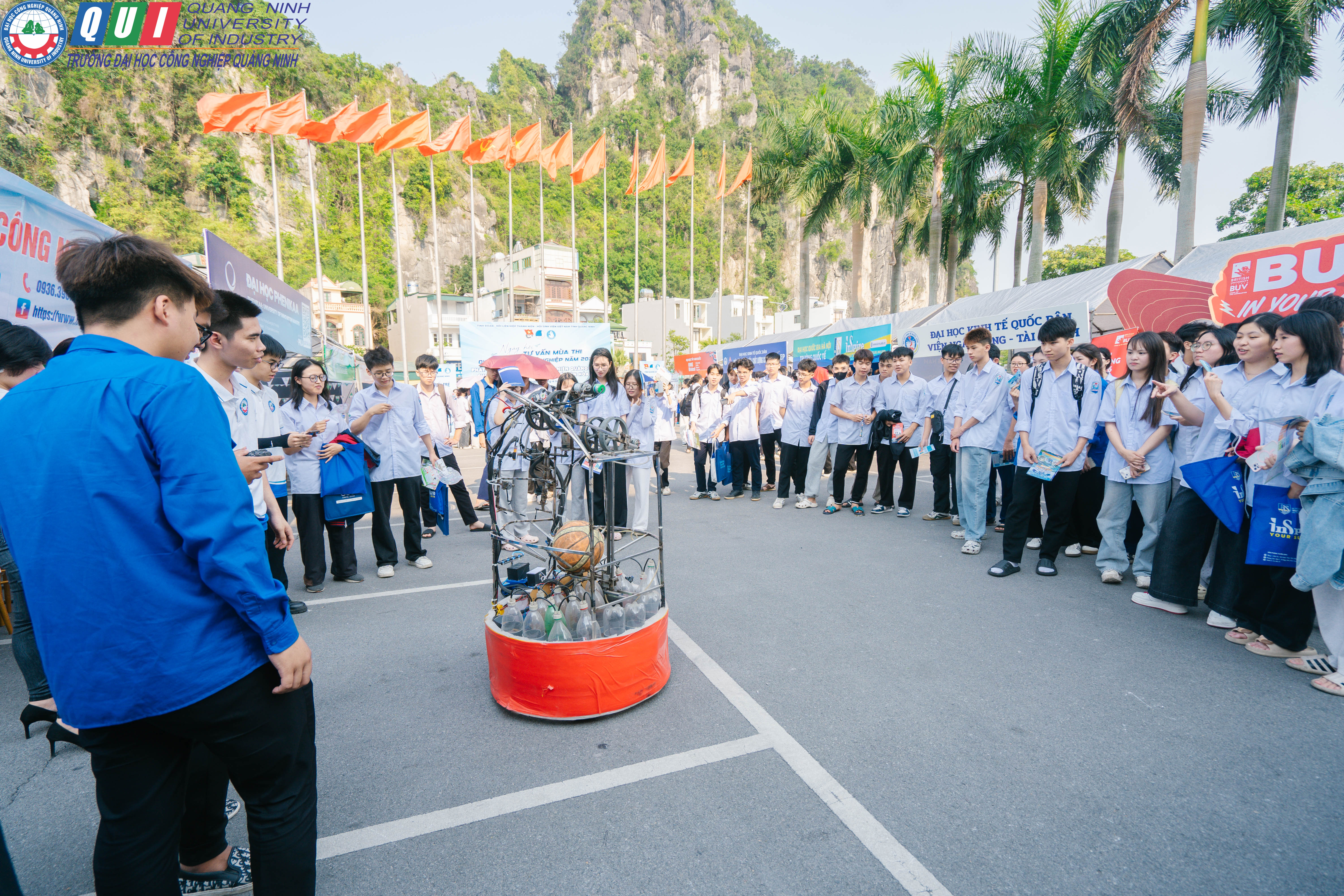 Bên cạnh đó gian hàng tư vấn của Trường Đại học Công nghiệp Quảng Ninh được thiết kế nổi bật, thu hút hàng trăm lượt học sinh đến tìm hiểu thông tin. Đội ngũ cán bộ, giảng viên và sinh viên Nhà trường đã trực tiếp tư vấn, giải đáp các nội dung liên quan đến ngành học, phương thức xét tuyển, tổ hợp môn, học phí, học bổng cũng như cơ hội việc làm sau khi tốt nghiệp.