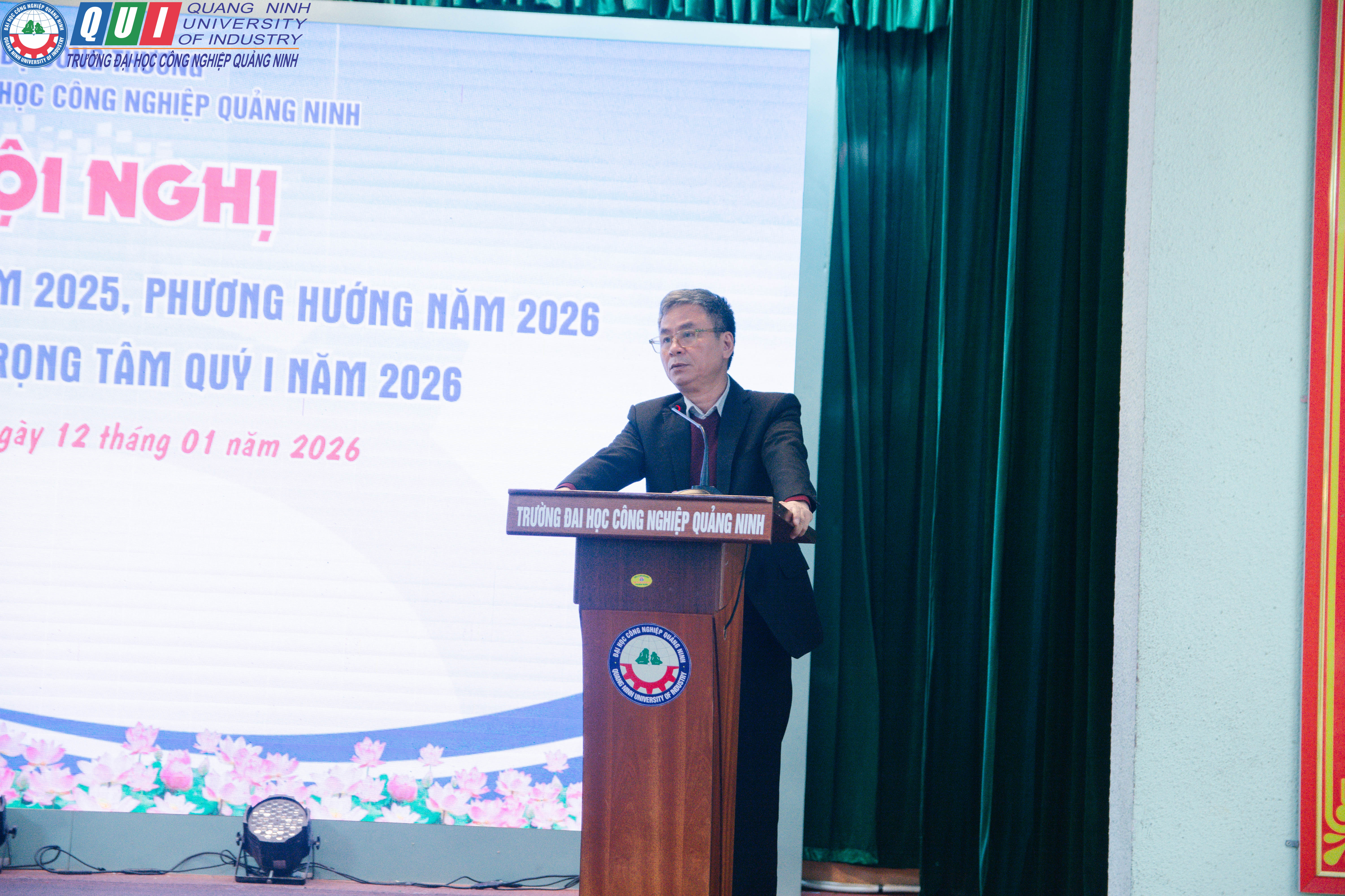 Phát biểu chỉ đạo tại hội nghị, TS. Hoàng Hùng Thắng - Hiệu trưởng Trường Đại học Công nghiệp Quảng Ninh nhấn mạnh: “Năm 2025 là năm Nhà trường phải đối mặt với nhiều khó khăn, song với tinh thần đoàn kết, trách nhiệm và đổi mới, tập thể cán bộ, viên chức, người lao động đã nỗ lực hoàn thành cơ bản các nhiệm vụ đề ra. Bước sang năm 2026, Nhà trường cần tiếp tục phát huy những kết quả đã đạt được, tập trung nâng cao chất lượng đào tạo, lấy người học làm trung tâm, đẩy mạnh ứng dụng khoa học công nghệ và chuyển đổi số trong quản lý, giảng dạy.” Hiệu trưởng đồng thời cũng yêu cầu các đơn vị trong toàn trường chủ động, sáng tạo trong triển khai nhiệm vụ, tăng cường phối hợp, nâng cao hiệu quả công việc, coi chất lượng và uy tín của Nhà trường là mục tiêu xuyên suốt trong mọi hoạt động.