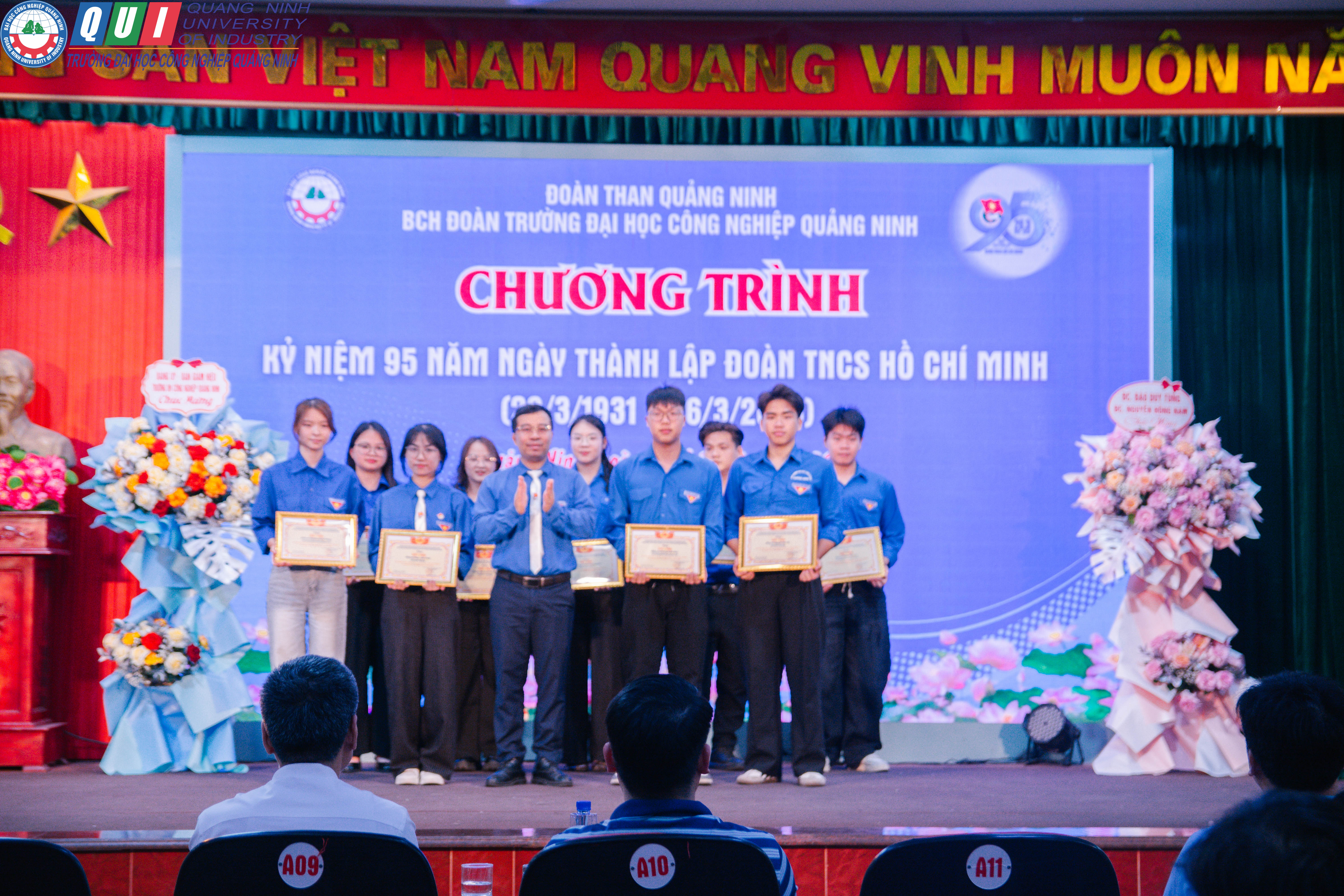Điểm nhấn của chương trình là hoạt động tuyên dương, khen thưởng các tập thể và cá nhân có thành tích xuất sắc trong học tập, rèn luyện và phong trào thanh niên. Đây là những tấm gương tiêu biểu, góp phần lan tỏa hình ảnh sinh viên Trường Đại học Công nghiệp Quảng Ninh năng động, sáng tạo và trách nhiệm.