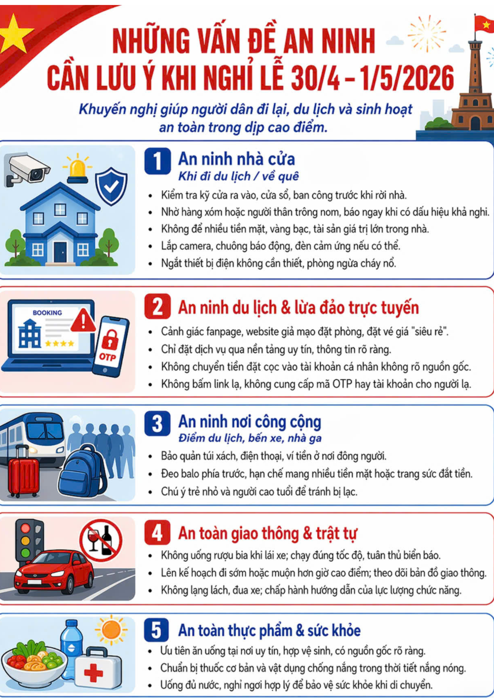 Thứ nhất: Bảo vệ "túi tiền" và tài sản cá nhân. Trước khi rời phòng trọ hay ký túc xá, hãy nhớ "Check-list": Khóa cửa kỹ càng, ngắt điện để phòng chống cháy nổ. Đặc biệt, trên không gian mạng, đừng để những "deal hời" về vé máy bay hay tour du lịch siêu rẻ làm mờ mắt. Hãy tỉnh táo trước các Fanpage giả mạo, tuyệt đối không click vào link lạ hay cung cấp mã OTP ngân hàng. Nhớ nhé: "Cảnh giác cao, không mất tiền oan!"