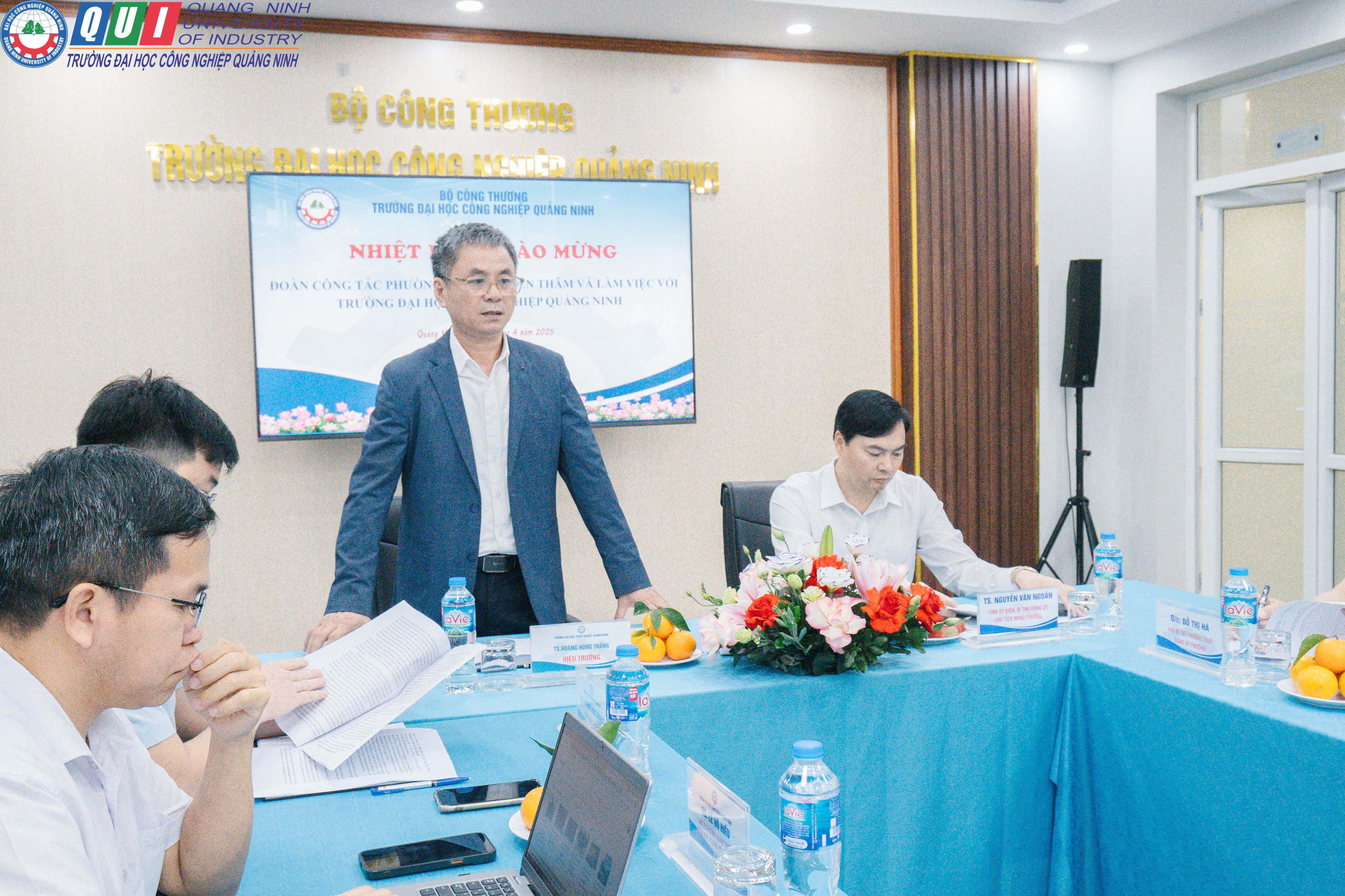 Tham dự buổi đón tiếp và làm việc Trường Đại học Công nghiệp Quảng Ninh có TS. Hoàng Hùng Thắng - Bí thư Đảng ủy, Hiệu trưởng; TS. Phạm Đức Thang - Phó Hiệu trưởng cùng các đồng chí lãnh đạo các phòng, khoa, đơn vị và đại diện các tổ chức đoàn thể trong Nhà trường.