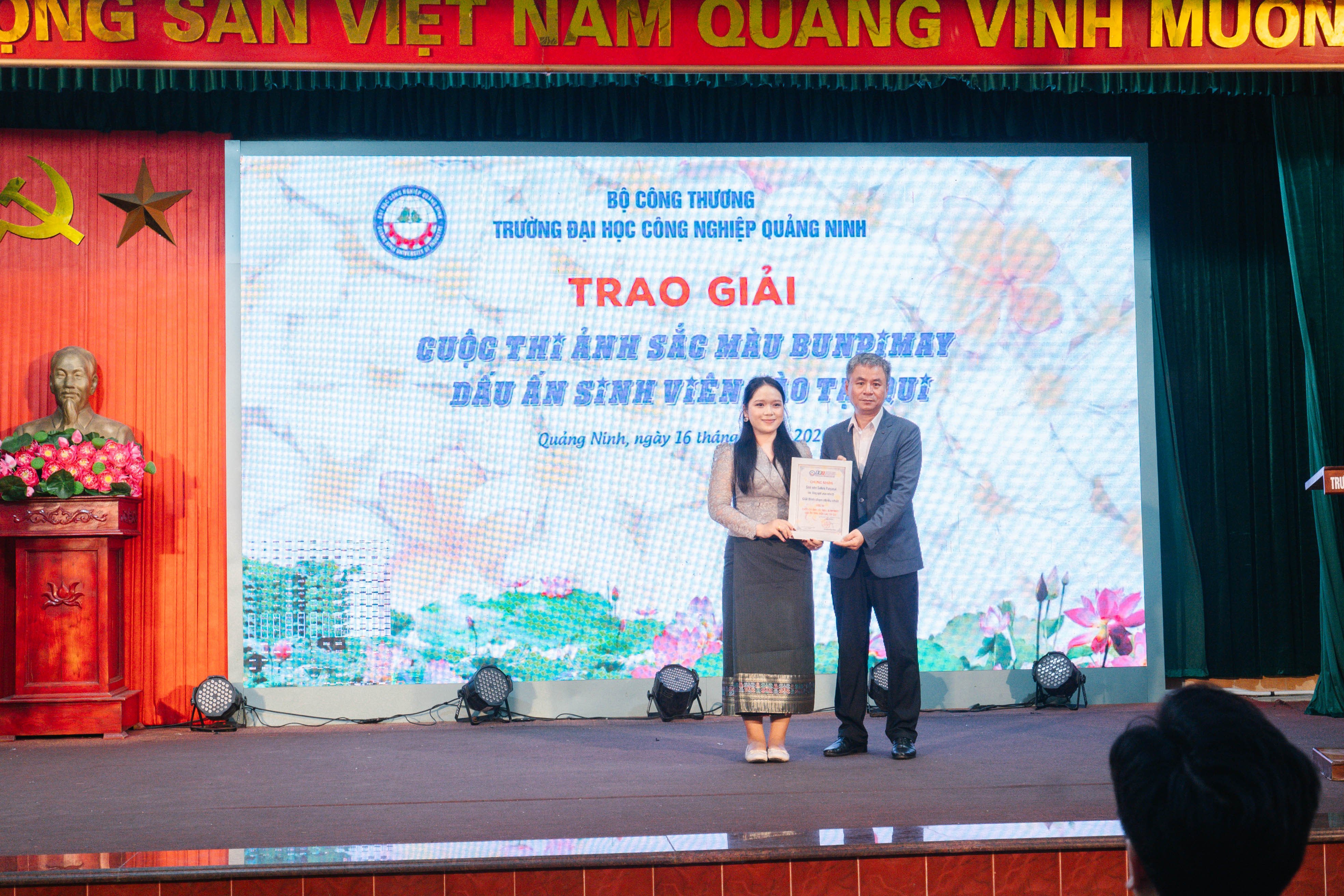 Đặc biệt, trong dịp này, Ban Tổ chức đã tổng kết và trao giải cuộc thi ảnh “Sắc màu Bunpimay - Dấu ấn sinh viên Lào tại QUI”. Cuộc thi thu hút đông đảo sinh viên tham gia với nhiều tác phẩm ấn tượng, phản ánh sinh động nét đẹp văn hóa truyền thống và đời sống học tập của sinh viên Lào tại Nhà trường.