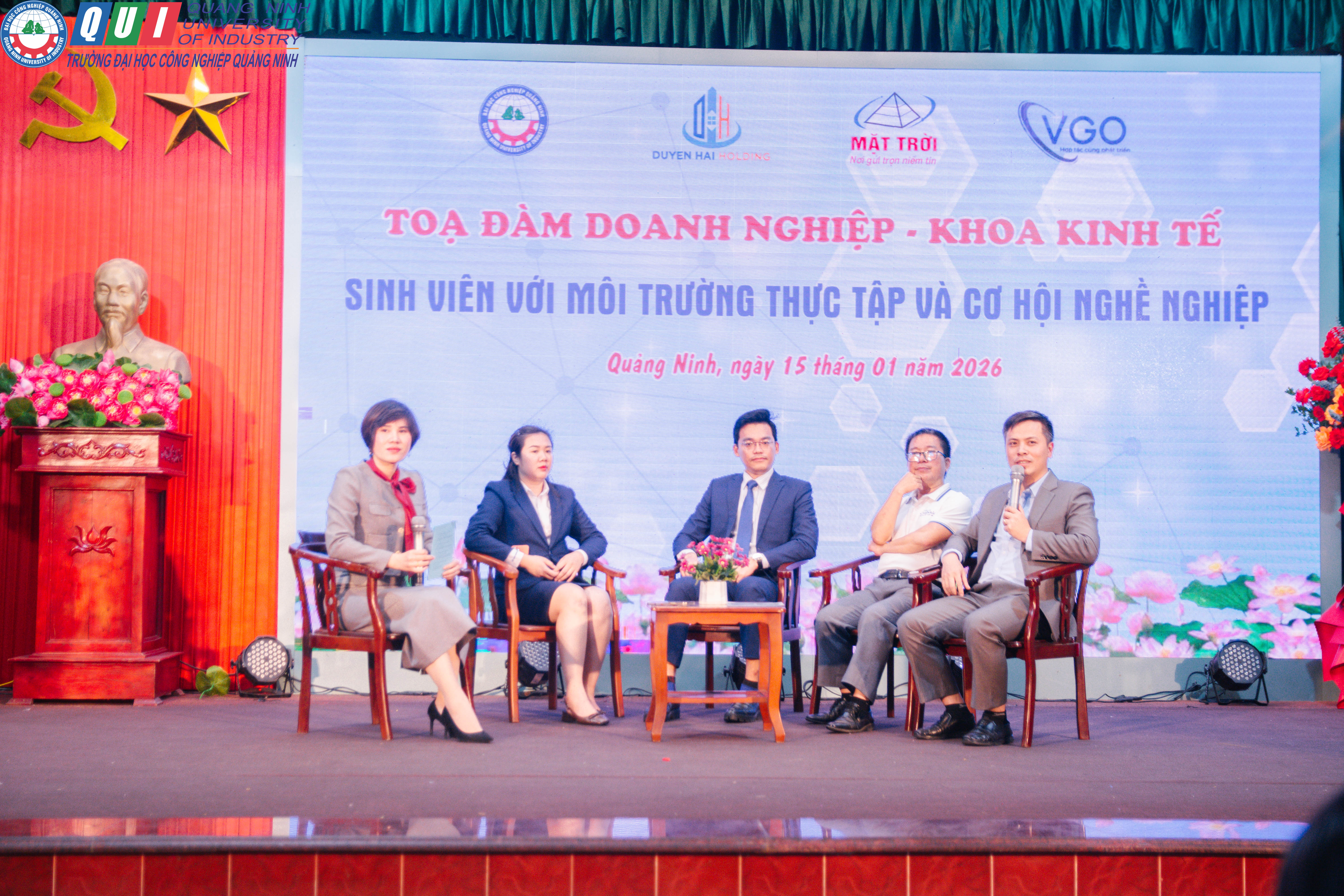 Tham gia buổi tọa đàm phía trường Đại học Công nghiệp Quảng Ninh có TS. Lãnh Thị Hòa - Trưởng khoa Kinh tế cùng toàn bộ giảng viên và sinh viên của khoa. Khách mời phía doanh nghiệp có đại diện lãnh đạo Ông Mai Văn Giang - GĐ phát triển nguồn nhân sự Công ty CP BĐS Duyên Hải; Ông Nguyễn Văn Long - Tổng GĐ Công ty CP Đào tạo và Phát triển nhân lực VGO; Ông Đỗ Văn Minh - Phó GĐ Công ty CP Thương mại Mặt Trời.