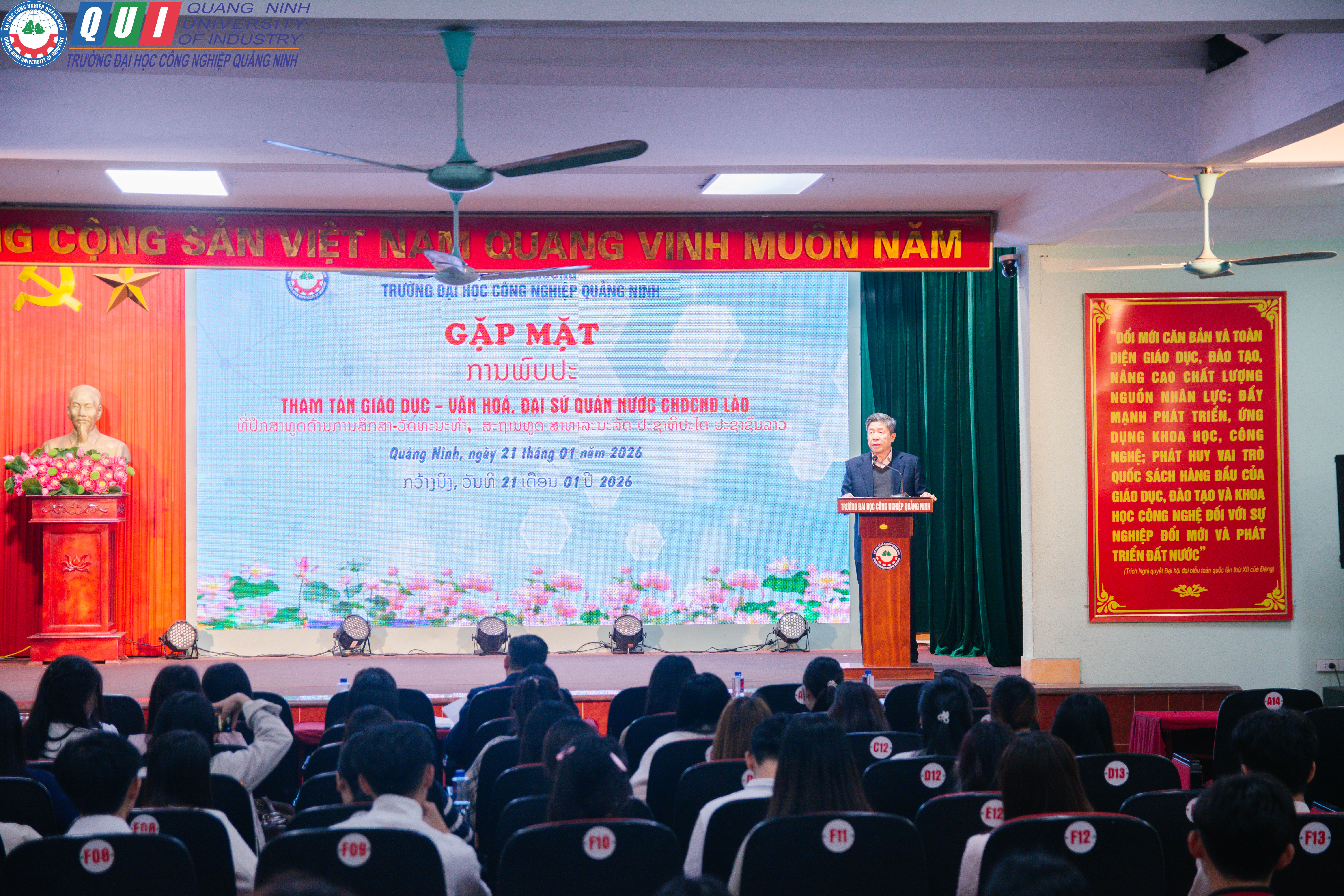 Chiều ngày 21/01/2026, Trường Đại học Công nghiệp Quảng Ninh đã tổ chức buổi đón tiếp và làm việc với Tham tán Giáo dục - Văn hóa, Đại sứ quán nước Cộng hòa Dân chủ Nhân dân Lào, nhằm trao đổi, tăng cường hợp tác trong lĩnh vực giáo dục, đào tạo và công tác quản lý lưu học sinh Lào đang học tập tại Trường.