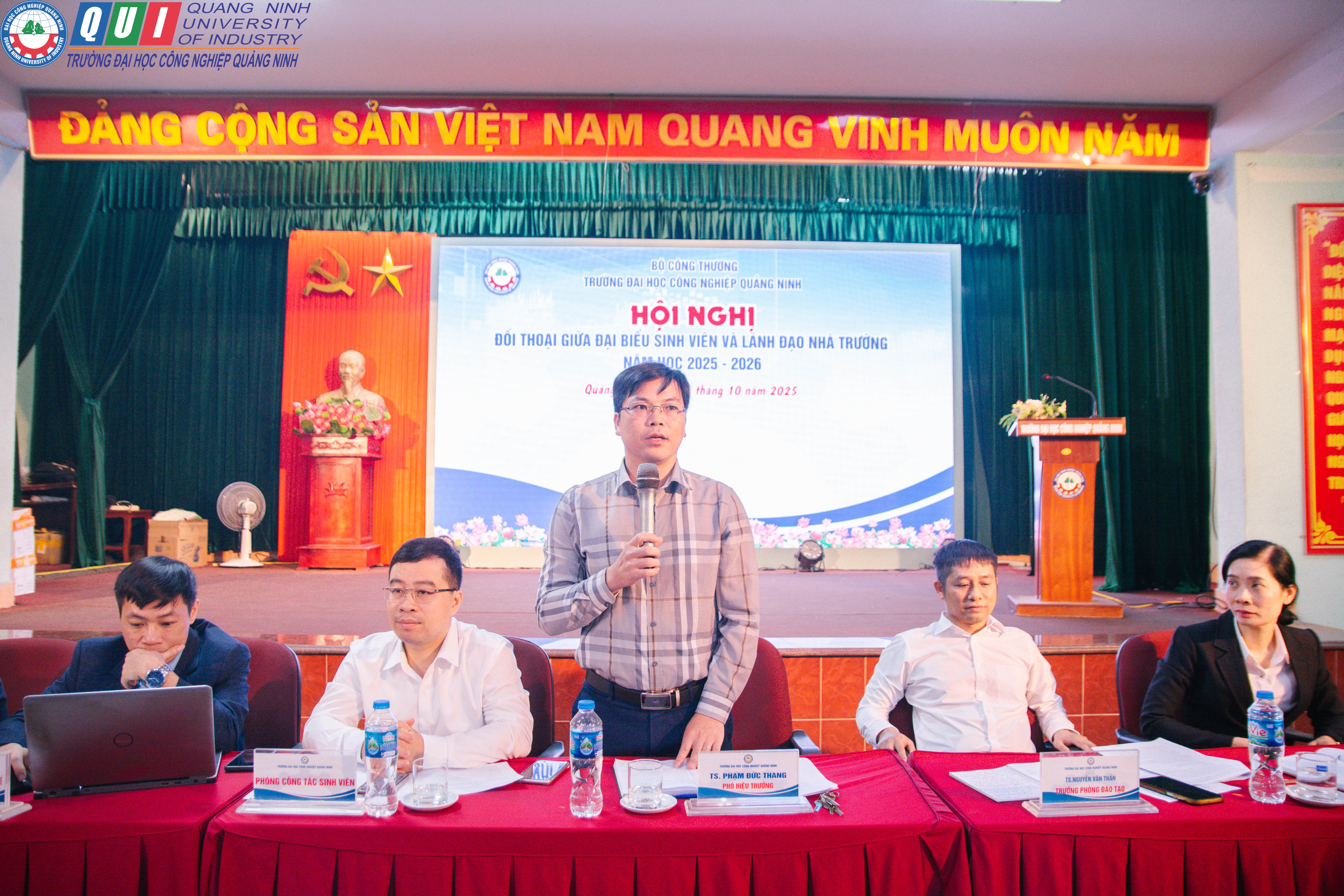 Phát biểu khai mạc buổi đối thoại, TS. Phạm Đức Thang - Phó Hiệu trưởng Trường Đại học Công nghiệp Quảng Ninh khẳng định:“Mỗi ý kiến của sinh viên đều là đóng góp quý báu giúp Nhà trường nhìn nhận rõ hơn thực tế học tập và sinh hoạt của các em. Chúng tôi luôn mong muốn được lắng nghe, được đồng hành và cùng sinh viên xây dựng một môi trường học tập năng động, sáng tạo và hiện đại hơn.”