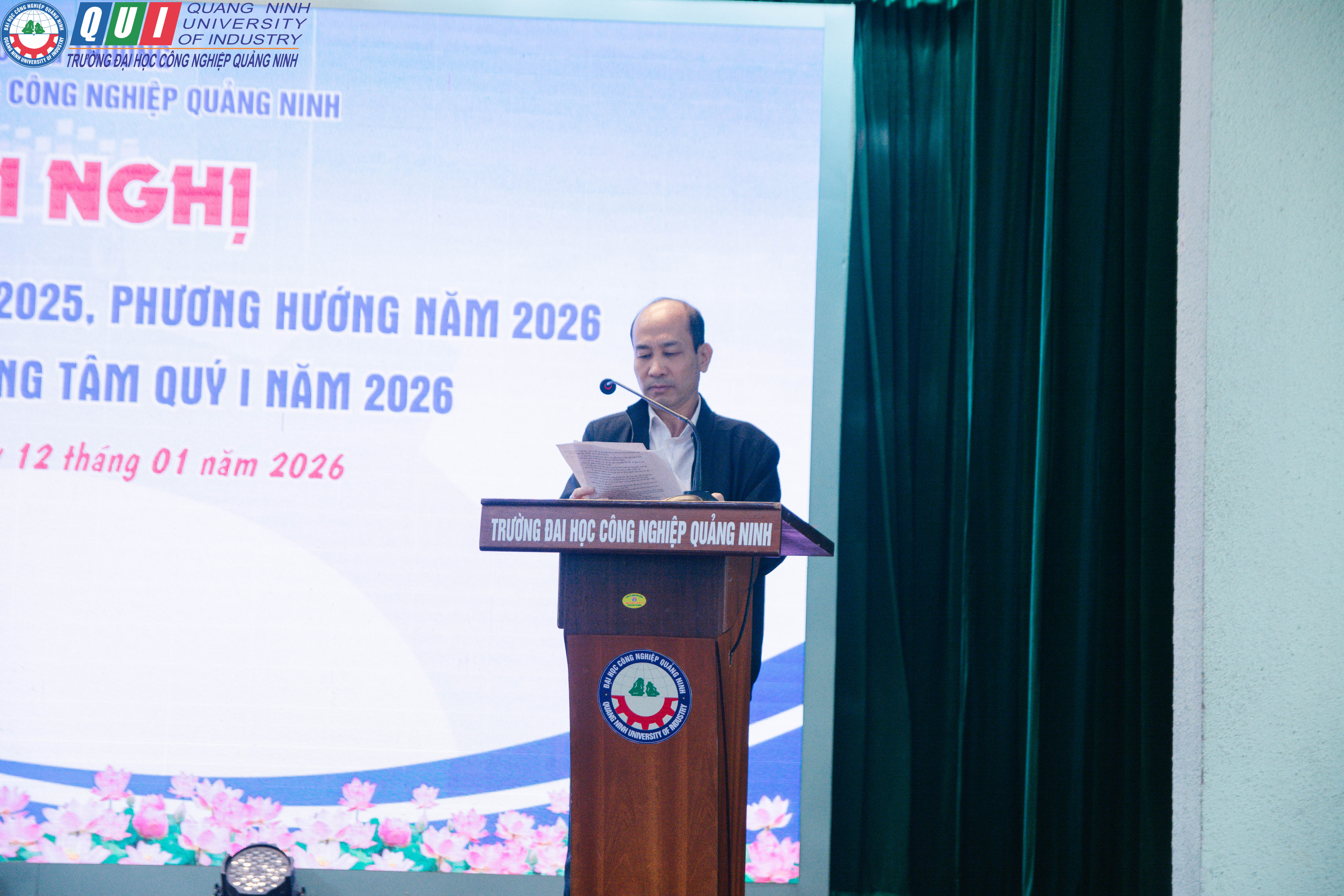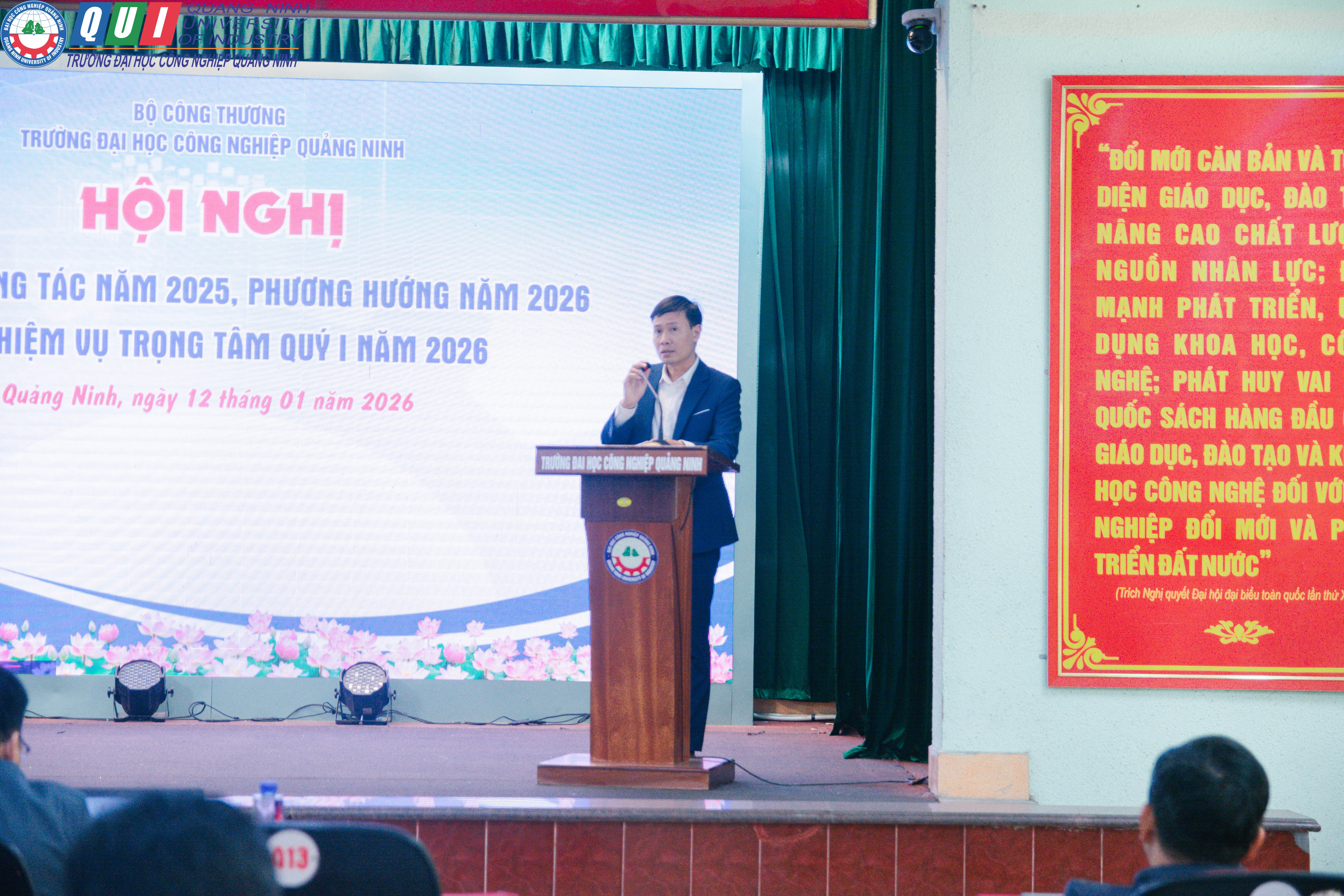 Phát biểu chỉ đạo tại hội nghị, TS. Hoàng Hùng Thắng - Hiệu trưởng Trường Đại học Công nghiệp Quảng Ninh nhấn mạnh: “Năm 2025 là năm Nhà trường phải đối mặt với nhiều khó khăn, song với tinh thần đoàn kết, trách nhiệm và đổi mới, tập thể cán bộ, viên chức, người lao động đã nỗ lực hoàn thành cơ bản các nhiệm vụ đề ra. Bước sang năm 2026, Nhà trường cần tiếp tục phát huy những kết quả đã đạt được, tập trung nâng cao chất lượng đào tạo, lấy người học làm trung tâm, đẩy mạnh ứng dụng khoa học công nghệ và chuyển đổi số trong quản lý, giảng dạy.” Hiệu trưởng đồng thời cũng yêu cầu các đơn vị trong toàn trường chủ động, sáng tạo trong triển khai nhiệm vụ, tăng cường phối hợp, nâng cao hiệu quả công việc, coi chất lượng và uy tín của Nhà trường là mục tiêu xuyên suốt trong mọi hoạt động.